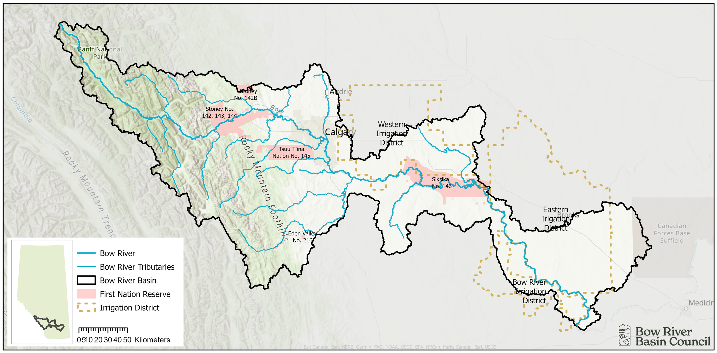 The City of Calgary, the Tsuut'ina Nation, Mînî Thnî, and Canmore are very close to the headwaters of the Bow River in Banff National Park.